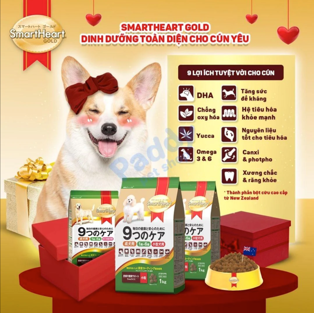 Đồ Ăn Chó Smart Heart Gold (1Kg) chứa Glucozamin & Chondroitin từ bột cừu hỗ trợ chức năng khớp & sụn, giúp xương khớp phát triển khoẻ mạnh.